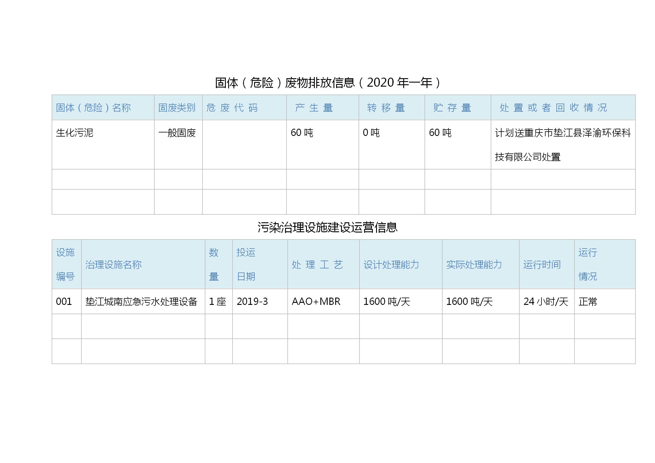 我司運營的墊江縣城南應急污水處理設施,處理規模:1600方/天,主體工藝采用:MBR一體化設備,出水排放標準:《城鎮污水處理廠污染物排放標準》GB18918-2002)一級B標,具體內容詳見環境信息公開表。