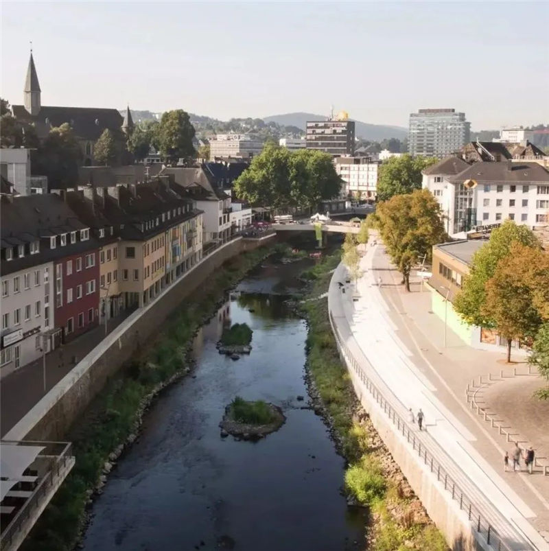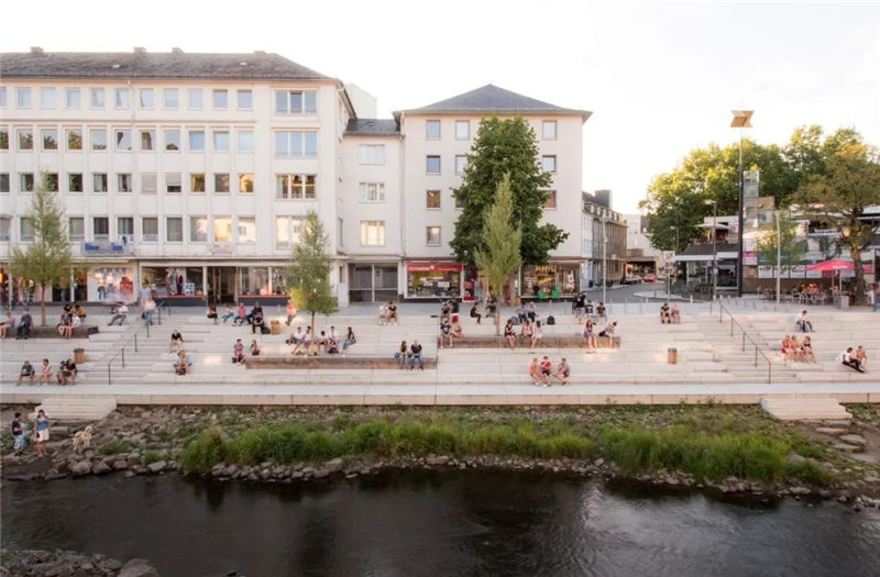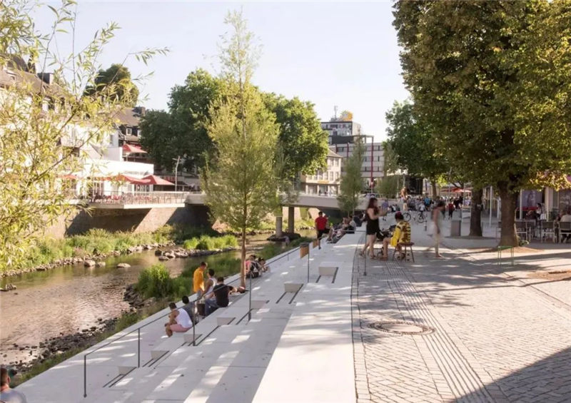 在拆除“ Siegplatte”(位于Sieg河堤防上的停車場)之后,2012年至2016年期間沿著河段的大規模臺階建設使得新的直接通往河段的河流成為可能。錫根市中心。希格(Sieg)自然化,擁有草皮的島嶼和岸堤,可以使水生動物和兩棲動物通過生物通道。180米長的樓梯雕塑在河邊,成為城市與河流互動的表演舞臺。鑒于西格(Sieg)的自然風光,西格特雷彭(Siegtreppen)變成了聚會場所。流域變成了上下城鎮之間的墊腳石。該項目獲得了無數獎項,并獲得了2017年德國景觀建筑獎的“綠色基礎設施作為戰略”類別。