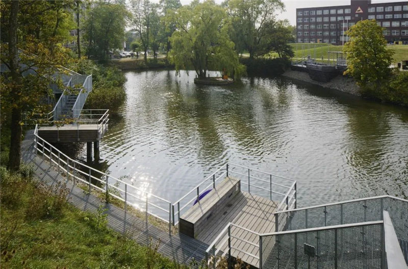 景觀設計的理念是讓人們以不同的方式去接近池塘陡峭的邊緣,這樣做的目的是在池塘周圍創造具有社會吸引力的場所和散步地。設計師建立了雙向設計原則,大池塘的西邊提供了可以駐足、坐下、觀景和約會的地方,這里的陽光甲板和平臺位于水面之上,靠近邊緣。而東區則恰恰相反,那里有一條蜿蜒的長廊,包含著一些較小的社交空間,沿著落差上下排布的樓梯在局部區域是一直延伸到水面的。