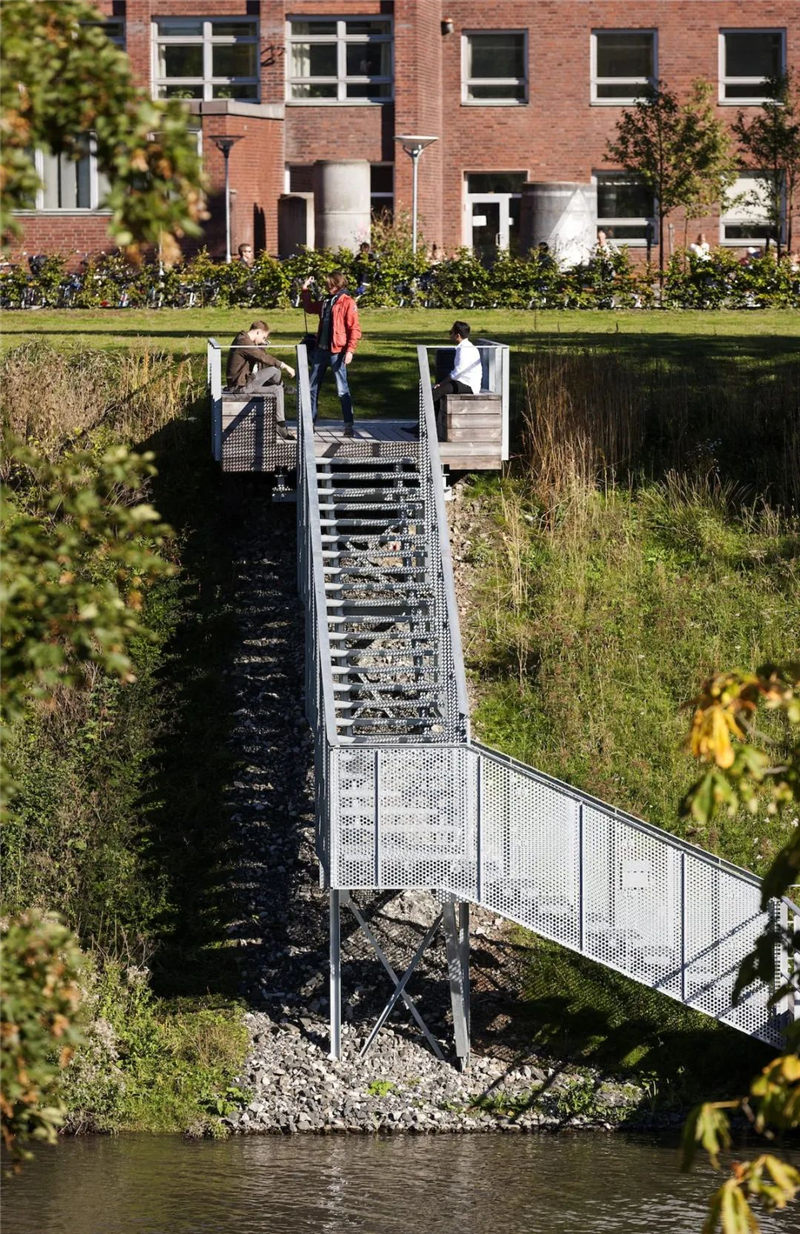因此,東邊和西邊的設計和所用的材料也有所不同,西邊的甲板選用的是木板。三個平臺分別被命名為休息室、涼亭和劇場,這也是設計這三個場地時所依據的概念。東邊是一個由拉伸鋼板和樓梯組成的裝配平臺,就像你在建筑工地上看到的那種類型,這也反映了學校的一些授課內容。東側是平緩的,幾乎漂浮在水面上,設計師在此精心安排了一條有趣的散步長廊;西側堅固、穩定、重力高,形成了休息和社交的場所。