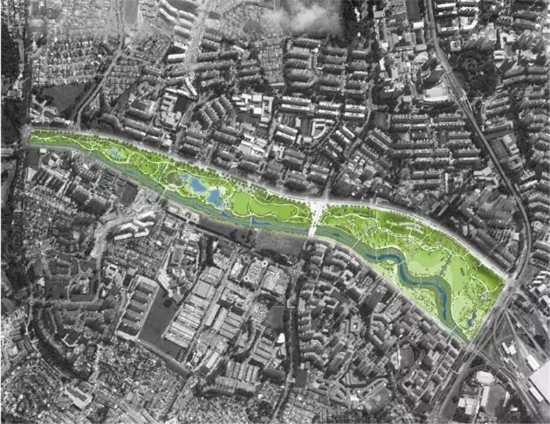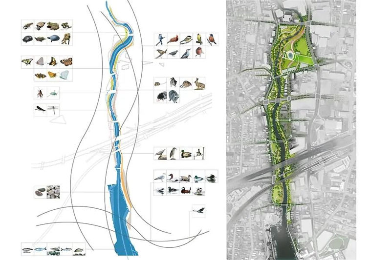 Group Superpositions的方案則提出采取另一種方法,從而將緊迫的生態遷移與更宏觀的文化變更結合在一起。新建的河流空間和原有運河河道上狹長型的新建花園通過復雜的設計建立起緊密的聯系。綿延的運河河道是建成這一矛盾體的關鍵,景觀既要有靜如止水的特點,又要引發人們探索的欲望,既是一個休閑而愜意的場所,又富有寓教于樂的意義;如果缺失任意一點,設計都不能構成一座真正的城市花園。